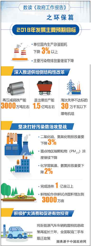 他強調(diào),要堅決打好三大攻堅戰(zhàn)。要圍繞完成年度攻堅任務(wù),明確各方責(zé)任,強化政策保障,把各項工作做實做好。推進污染防治取得更大成效。鞏固藍天保衛(wèi)戰(zhàn)成果,今年二氧化硫、氮氧化物排放量要下降3%,重點地區(qū)細顆粒物(PM2.5)濃度繼續(xù)下降。推動鋼鐵等行業(yè)超低排放改造。提高污染排放標(biāo)準(zhǔn),實行限期達標(biāo)。開展柴油貨車超標(biāo)排放專項治理。深入推進水、土壤污染防治,今年化學(xué)需氧量、氨氮排放量要下降2%。實施重點流域和海域綜合治理,全面整治黑臭水體。加大污水處理設(shè)施建設(shè)力度,完善收費政策。嚴禁“洋垃圾”入境。加強生態(tài)系統(tǒng)保護和修復(fù),全面劃定生態(tài)保護紅線,完成造林1億畝以上,耕地輪作休耕試點面積增加到3000萬畝,擴大濕地保護和恢復(fù)范圍,深化國家公園體制改革試點。嚴控填海造地。嚴格環(huán)境執(zhí)法。我們要攜手行動,建設(shè)天藍、地綠、水清的美麗中國。