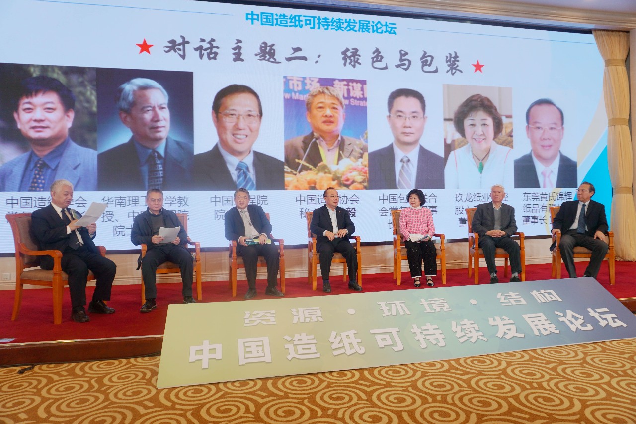 中國(guó)造紙學(xué)會(huì)常務(wù)副理事長(zhǎng)曹振雷主持了“綠色與包裝”主題對(duì)話,邀請(qǐng)華南理工大學(xué)教授、中國(guó)工程院院士陳克復(fù),中國(guó)清潔生產(chǎn)的奠基人之一、中國(guó)工程院院士段寧,中國(guó)包裝聯(lián)合會(huì)常務(wù)副理事長(zhǎng)兼秘書長(zhǎng)王躍中,中國(guó)造紙協(xié)會(huì)秘書長(zhǎng)錢毅,玖龍紙業(yè)(控股)有限公司董事長(zhǎng)張茵,東莞黃氏錦輝紙品有限公司董事長(zhǎng)黃勝雄等6位嘉賓進(jìn)行交流,造紙行業(yè)在科技進(jìn)步、包裝生產(chǎn)流通、紙業(yè)的經(jīng)濟(jì)貢獻(xiàn)、電商的促進(jìn)作用、環(huán)境保護(hù)取得的進(jìn)步等話題進(jìn)行了深入探討。