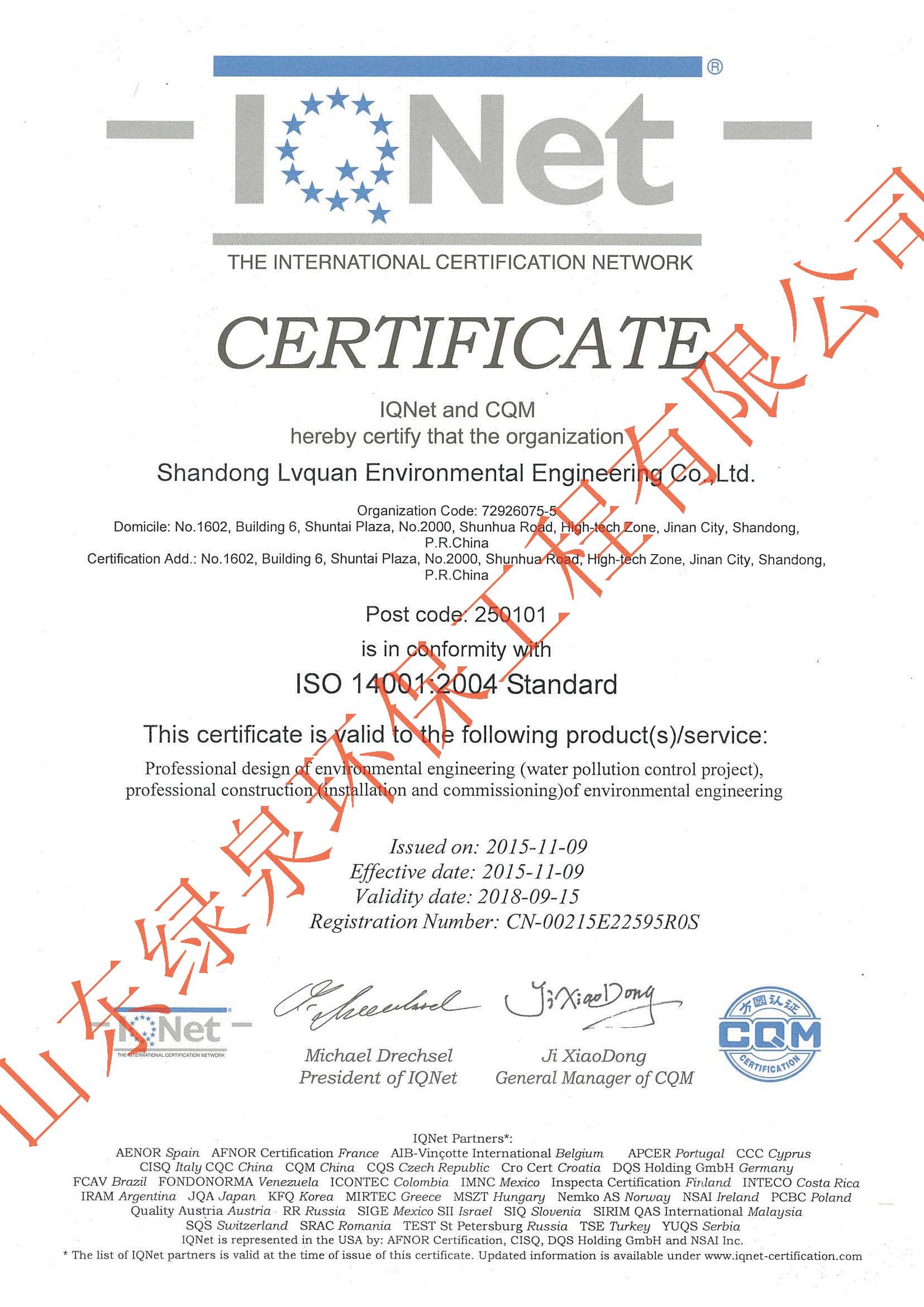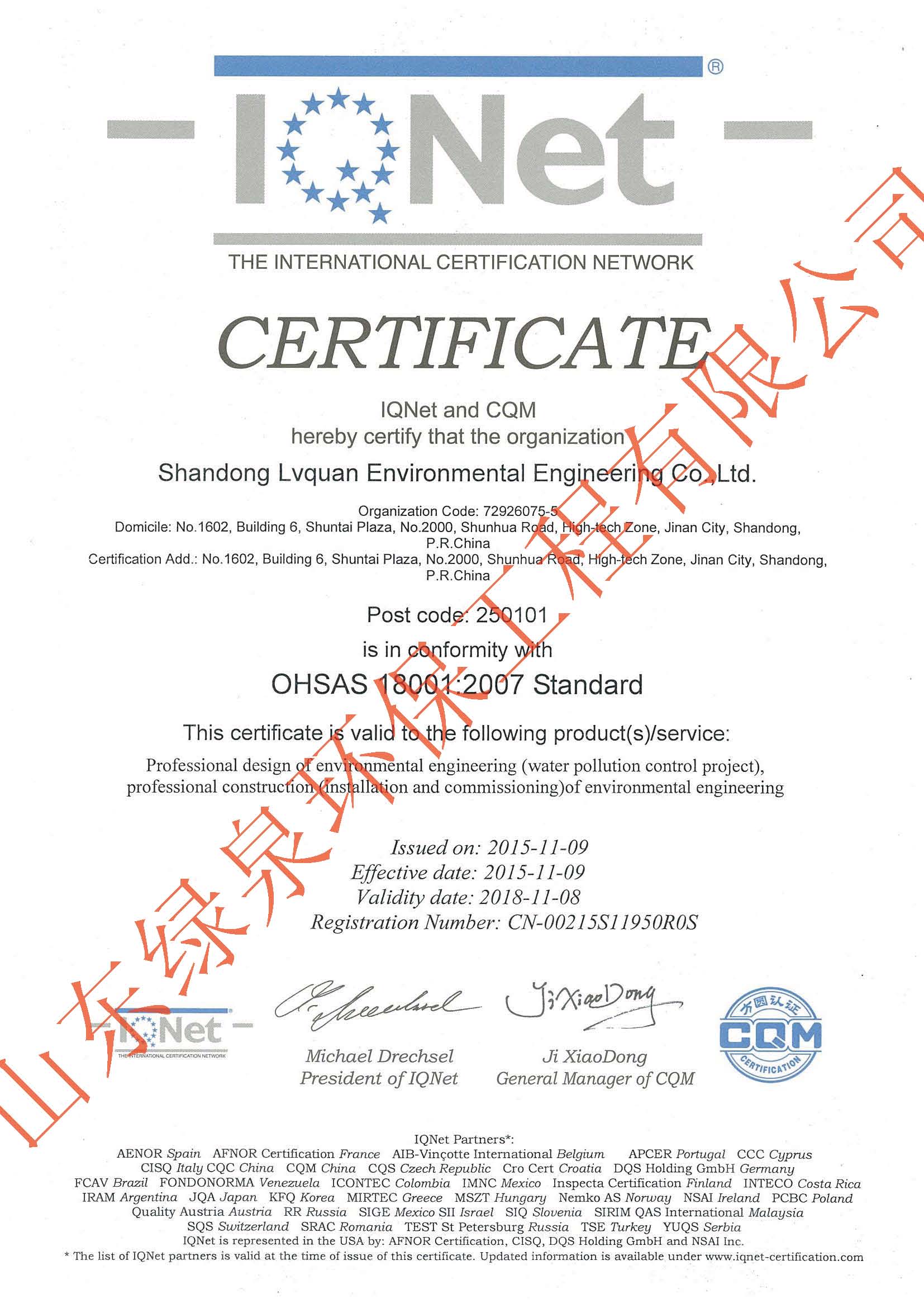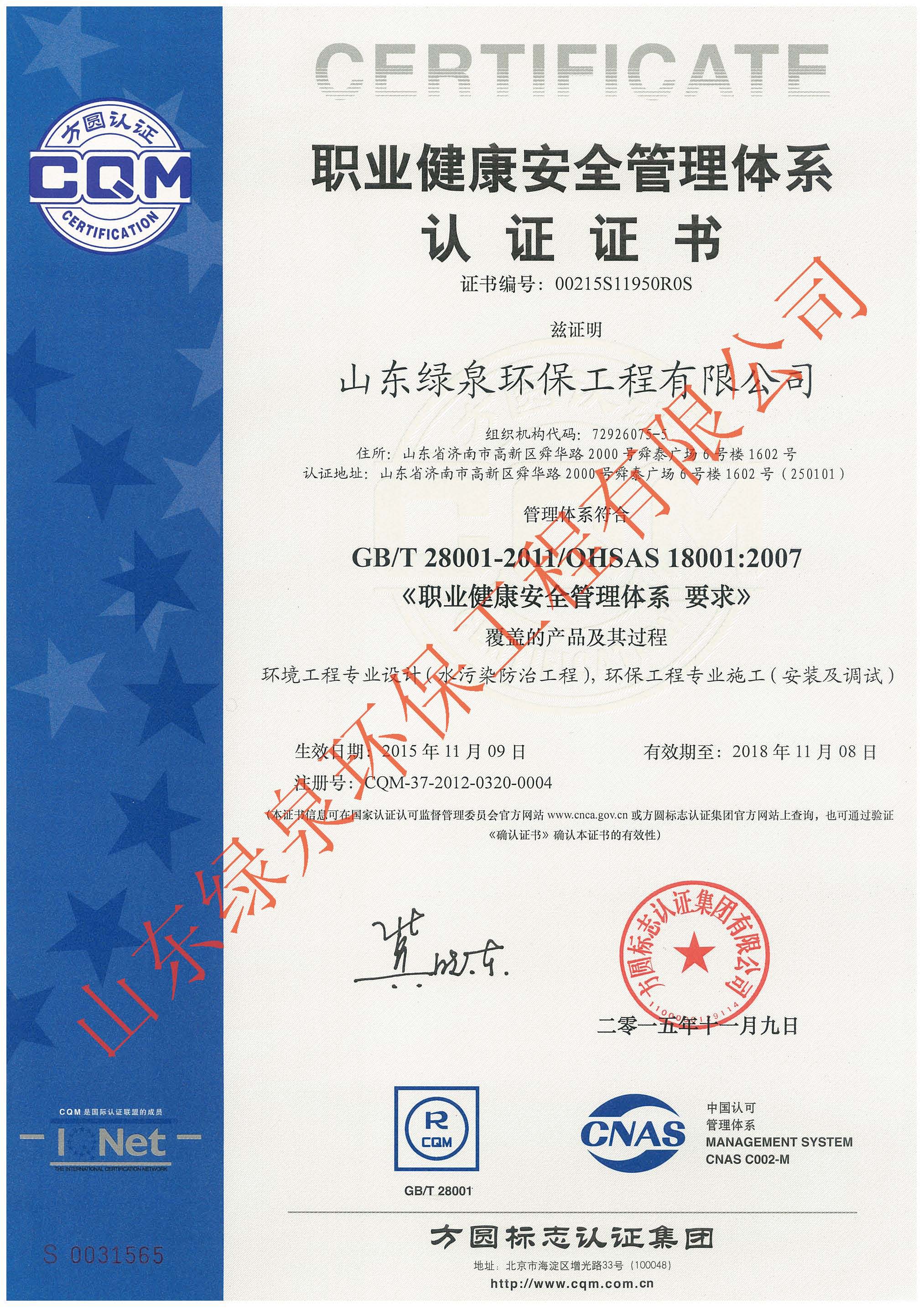 在公司員工的不懈努力下,經(jīng)過方圓認證專家的全面、嚴格、細致的指導和審核,確認我公司環(huán)境/職業(yè)健康安全管理體系符合ISO14001:2004/OHSAS18001:2007標準的要求,并于2015年11月9日,向我公司正式頒發(fā)了ISO14001和OHSAS18001管理體系認證證書。
